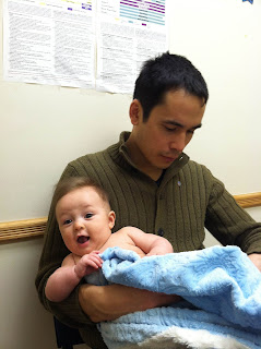 Then we went to the pediatrician for our 4-month checkup and immunizations. Once again we got a big, "Wow!" from the doctor when she checked Augie's height and weight: he's now 26.5 inches long and weighs 16lbs 6oz. That's 90th percentile height, 75th percentile weight. Which is amazing, because two months ago he was in the 75 percentile for weight but the 50th percentile for height/length, so he's really shot up in the last two months. Go mama's milk!